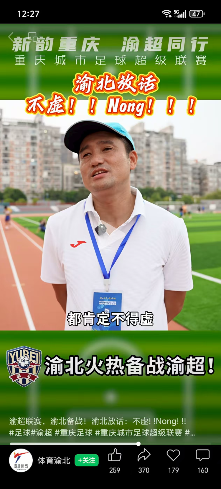 据“体育渝北”官方视频号消息,渝北区足球队主教练是王祥,前重庆力帆足球队球员。他介绍,选拔出的40个球员在“渝超”中竞争力还是很强,他对渝北队的实力很有信心。“我们渝北区碰到哪个都肯定不得虚。”“随便你们啷个,必须NONG(弄,打服之意)你们。”